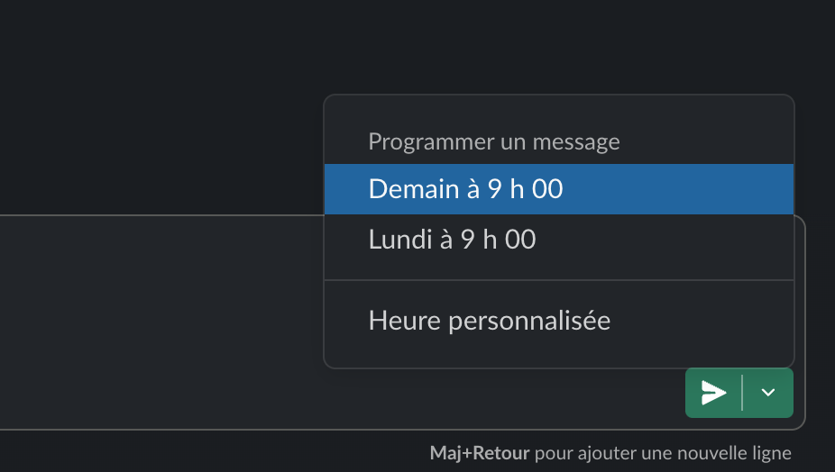 Envie d’écrire un truc à 23h ? Programme l’envoi pour demain matin, Slack le permet, et vos collègues vous diront merci.