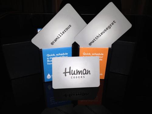Par exemple, sur les cartes de visites Human Coders, nous n’avons mis que notre Twitter :)