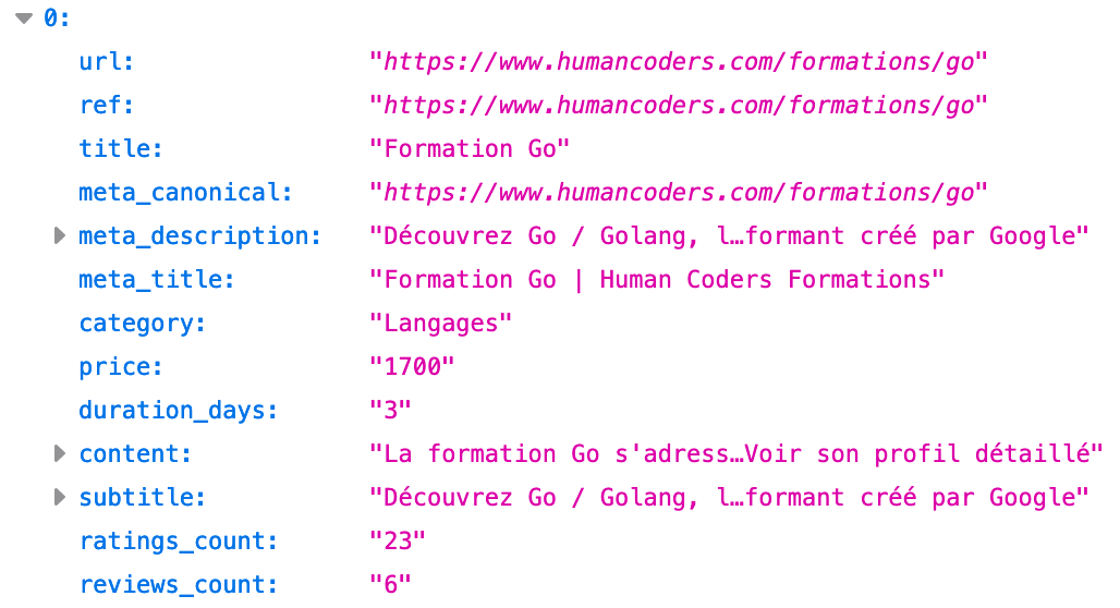 As you can see, for each attribute of the JSON, we assign it to the courses attribute if it exists. Otherwise, we add it as "others" in the dictionary. We would have liked to have a more generic model for courses. But the Metabase editor does not manage jsonb at the moment, and we have chosen to have specific fields for most of the data that we thought to search/filter/sort/etc.