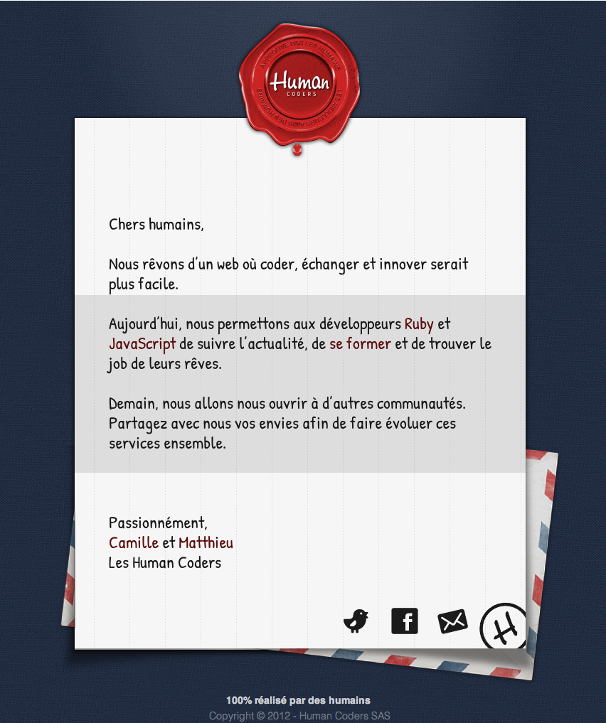 Nous avons alors enchaîné les brainstormings, trouvé un nouveau slogan, revu l'architecture du site, réécrit tout le contenu, trouvé des inspirations, choisi un designer (merci Fred !), reçu des maquettes, fait pleins d'itérations, trouvé un intégrateur, changé d'inté pour partir avec un super inté (merci Thierry !), fait des feedbacks... Avec tout cela, fin juillet, humancoders.com était enfin prêt ! Cela nous a pris bien plus de temps que nous l'imaginions, mais le résultat était là.