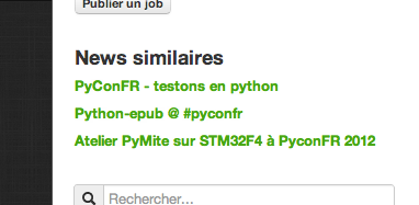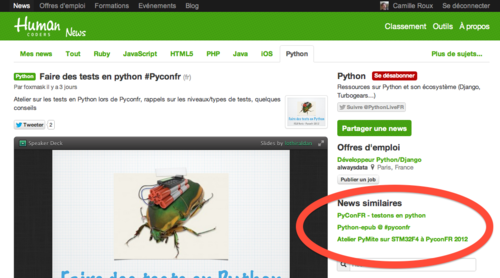 Vous pourrez ainsi vous ballader de news en news. Par exemple, dans le cas d’une présentation faite à la PyConFR 2012, le bloc “News similaires” affiche les autres présentations de cet événement :