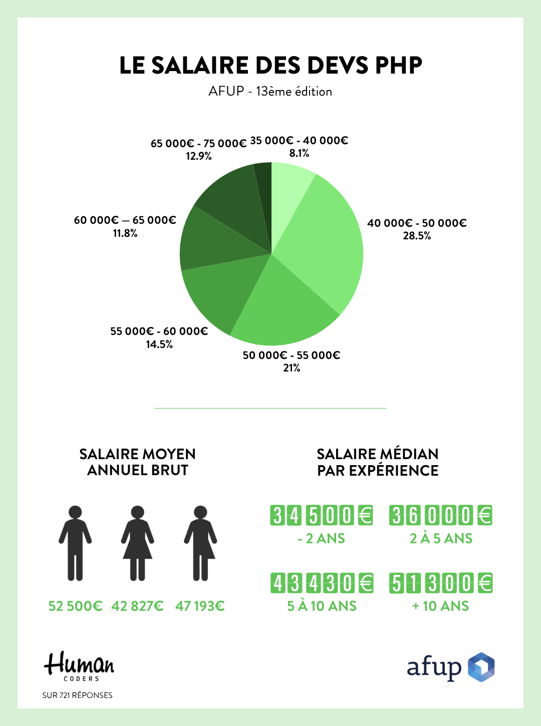 - Plus de 28% des devs gagnent entre 40 000€ et 50 000€ brut par an.
