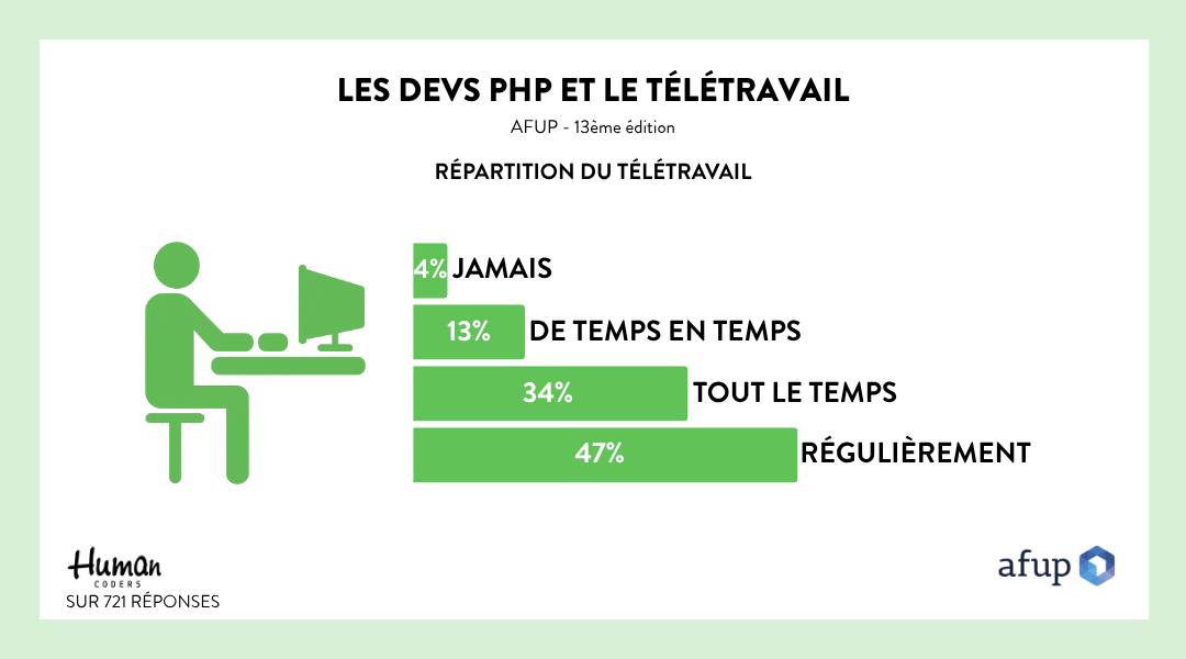 - 96% des devs font du télétravail (ici, nous comptons toute personne ayant répondu “au moins de temps en temps”). 35% ont déclaré l’être à temps plein.