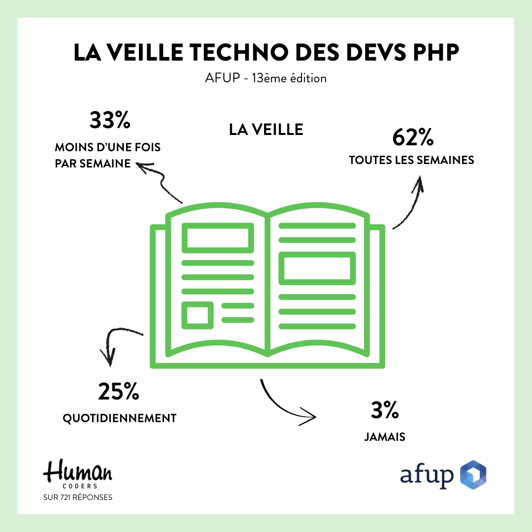 Ce qu'on retient : Il est important de relever que les répondant·e·s au baromètre sont souvent déjà proches de la communauté (AFUP, événements, veille, etc.). Il est donc probable que la pratique de la veille soit un peu surreprésentée ici par rapport à l’ensemble des devs PHP en France.