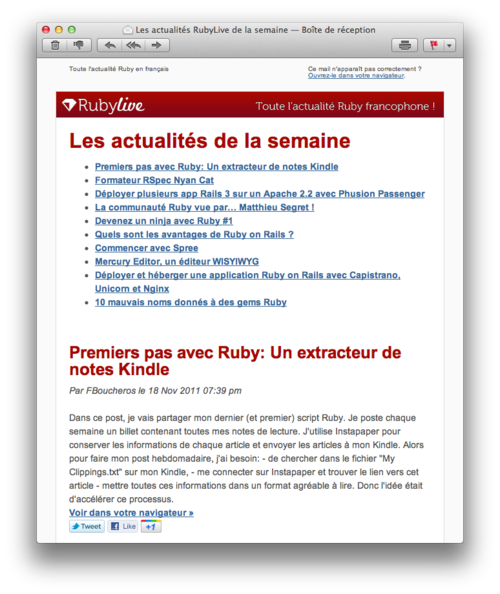 C’est ainsi que nous avons le plaisir de vous annoncer l’arrivée de la newsletter hebdomadaire ! Il suffit de vous inscrire grâce au bloc dédié dans la barre de droite de RubyLive. Ainsi, vous recevrez le meilleur de l’actualité Ruby directement dans votre boîte mail chaque semaine !